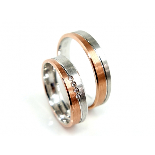 Snubní prsteny vyrobené ze 14kt zlata bílé kombinované s čerbveným zlatem. Prsteny zdobené matováním, dámský zirkony/brilianty/moissanity v ceně 19500,-