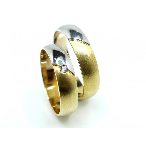 Snubní prsteny v kombinaci bílého a žlutého 14kt zlata v lesklém provedení . Dámský prsten zdobený zirkonem/briliantem/moissanitem v ceně 15850,-