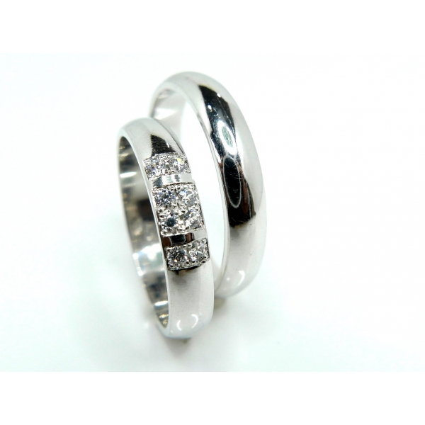 Snubní prsteny vyrobené ze 14kt zlata. Bílé kameny- v tomto případě zirkony/brilianty/moissanity (v ceně 22800.-) tvoří ozdobný prvek v dámském prstenu. Jsou určeny pro páry, kdy muž preferuje jednoduchost a čistou linii a žena má ráda třpyt kamínků. prsteny lze vyrobit ve žlutém i červeném zlatě