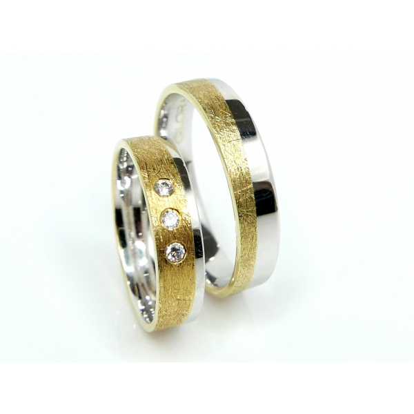 Snubní prsteny vyrobeny v kombinaci bílého a žlutého zlata zdobené matováním, dámský prsten ozdobený zirkony/brilianty/moissanity