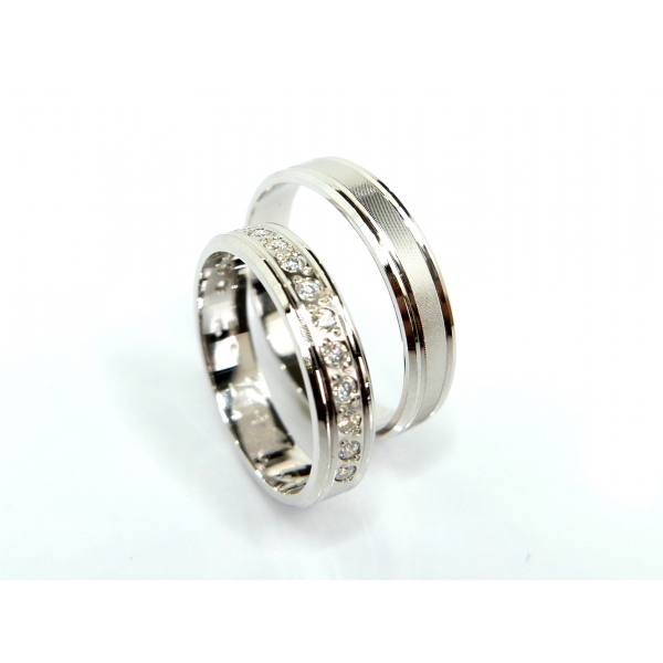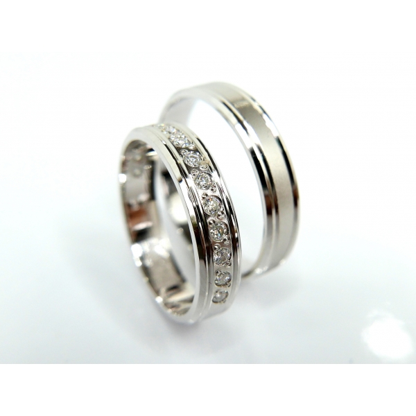 Snubní prsteny z bílého 14kt zlata s módním matováním. Dámský prsten se zirkony/brilianty/moissanity v ceně 22600.-