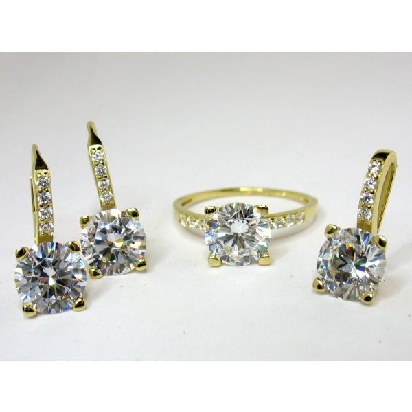 Luxusní souprava ze žlutého zlata se zirkony. Náušnice na patentové zapínání. Velikost prstene 56.Lze zhotovit v bílém zlatě.