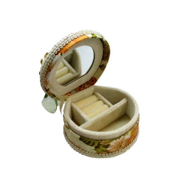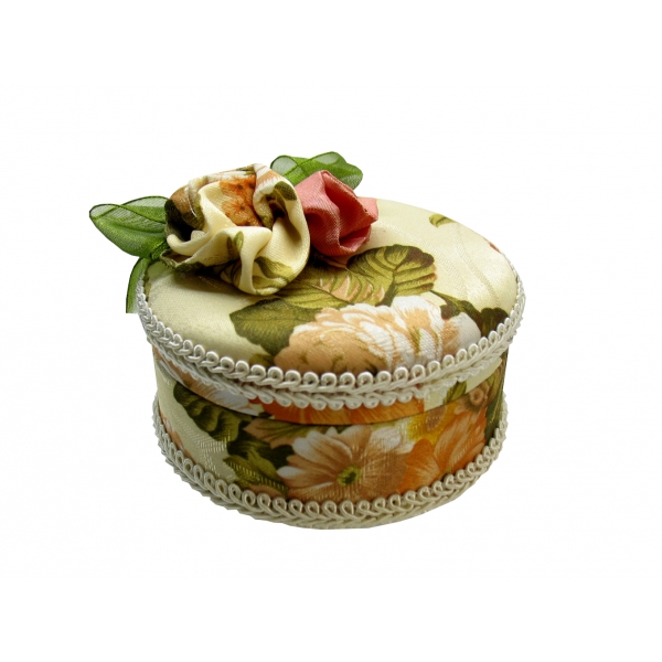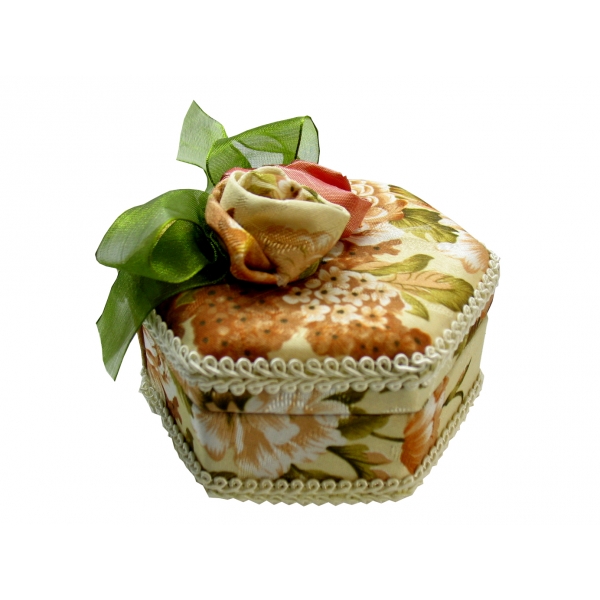 Menší šperkovnice s látkovým potahem zdobená květy , tři druhy provedení- srdce , kulatá a 6ti hran, průměr cca 11cm
