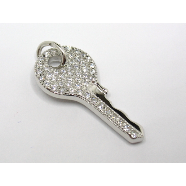 Velký přívěšek v podobě klíče je zdobený zirkony.Rhodiované stříbro.