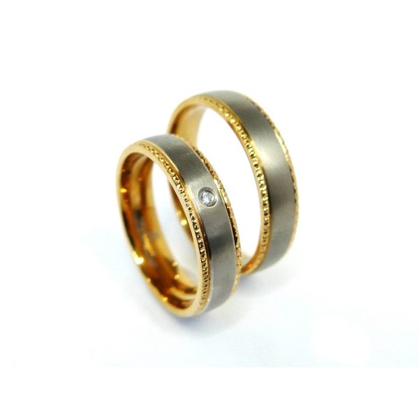 Snubní prsteny vyrobené z titanu zlacené 14kt zlatem , dámský prsten zdobený briliantem