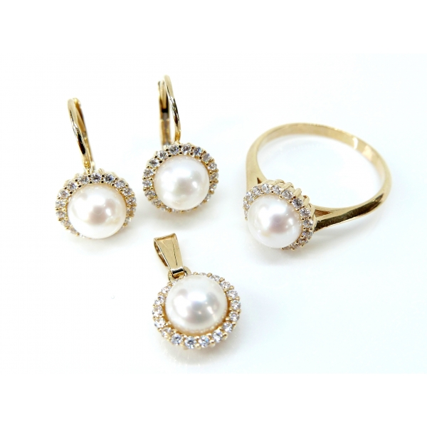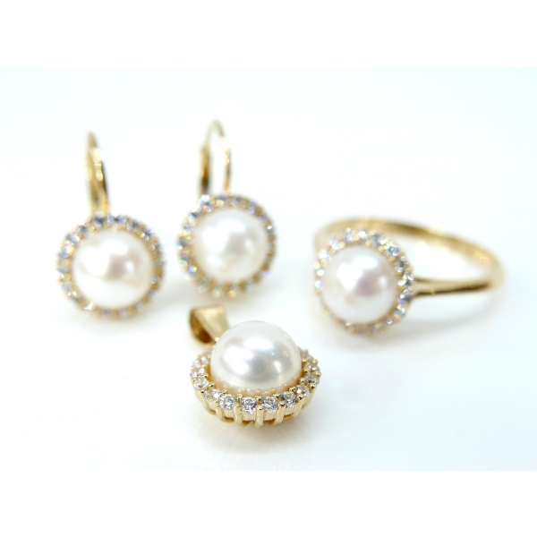 Luxusní souprava vyrobená ze žlutého 14kt zdobená zirkony a perlou. Prsten 5880,- Náušnice 7990,- přívěšek 3250,-