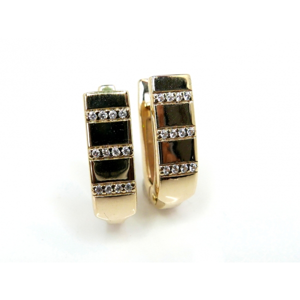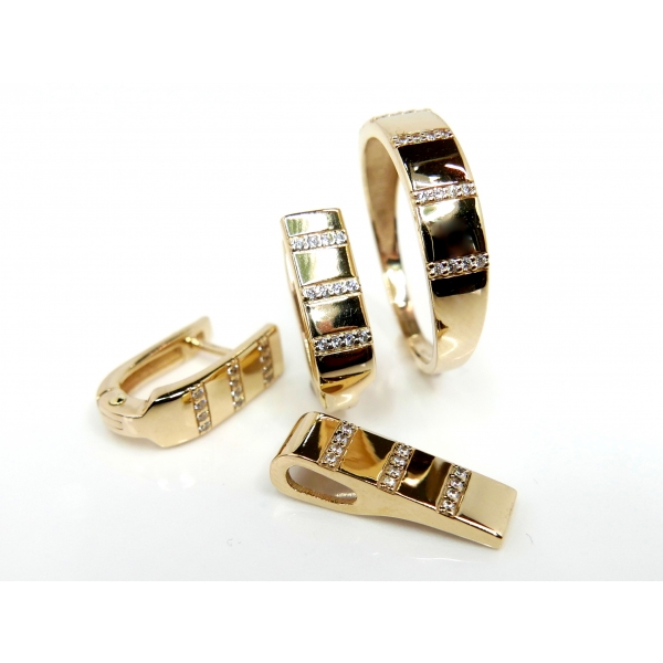 Luxusní souprava ze 14kt zlata .Hladký a jednoduchý tvar tohoto setu velmi vhodně zdobí bílé zirkony/brilianty v řadách. Náušnice 8890,-/25600,-dia, přívěšek 3070,-/11470,-dia a prstýnek 5780,-/19780,- dia