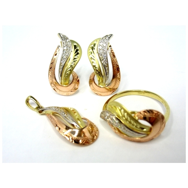 Luxusní zlatá souprava s trojkombinací zlata . Souprava obsahuje náušnice 6400,- přívěšek 2950,- a prsten 4800,-.