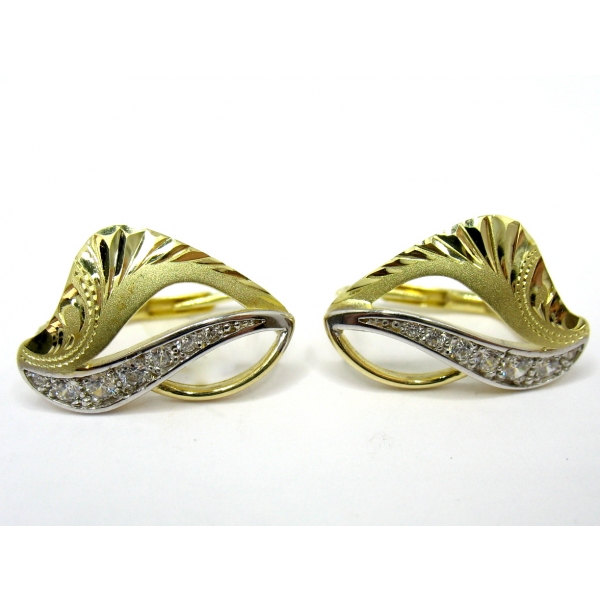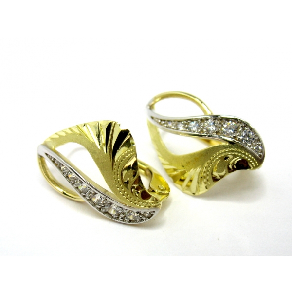 Náušnice vyrobené ze 14 k zlata, zdobené červeným a bílým zlatem, posázené zirkony, klasický patent