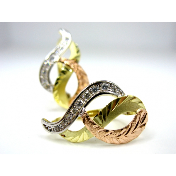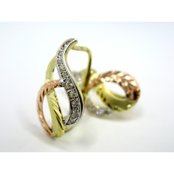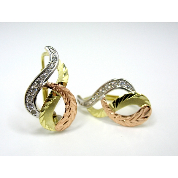 Náušnice vyrobené ze 14 k zlata, zdobené zirkony a červeným zlatem.