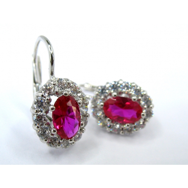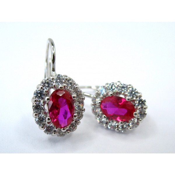 Náušnice vyrobené ze 14k zlata. Náušnice zdobí výrazný středový kámen v rubínové barvě a bílé zirkony