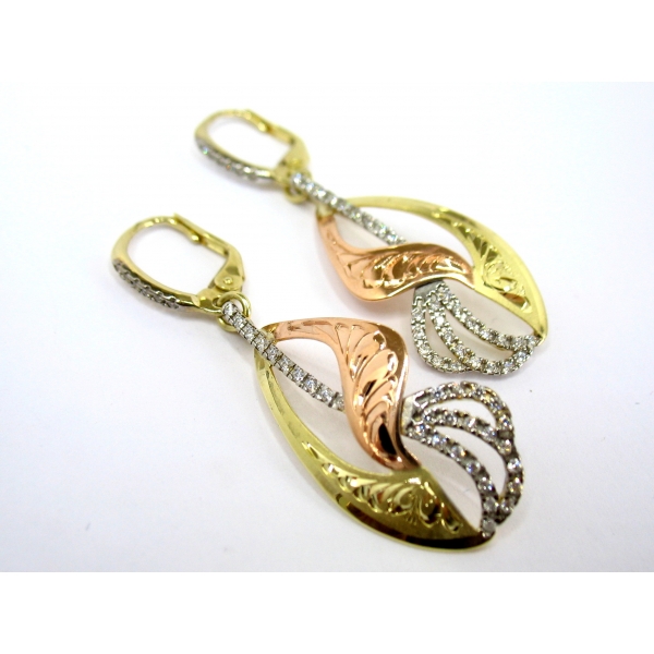 Náušnice vyrobené ze 14k zlata se zirkony a kombinaci barev. Luxusní visací náušnice na patent