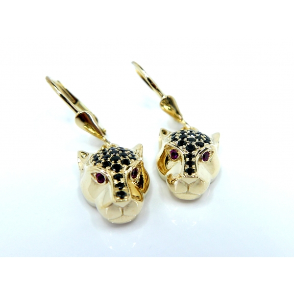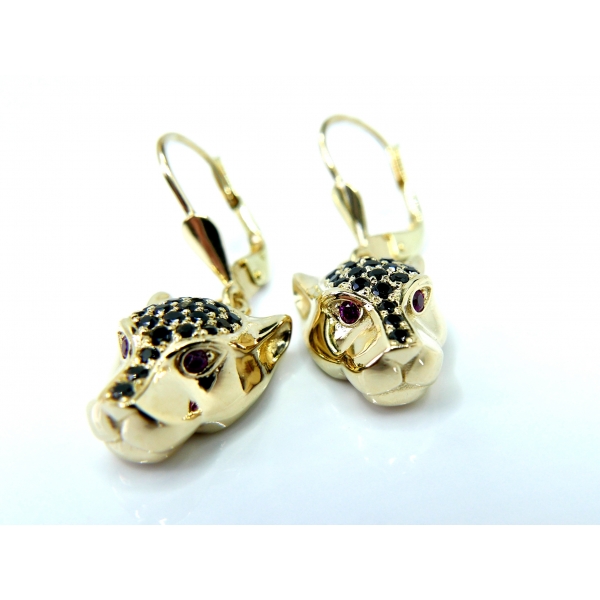 Luxusní 3D zpracování náušnic vyrobených ze 14kt zlata . Hlava pumy je posázená černými zirkony