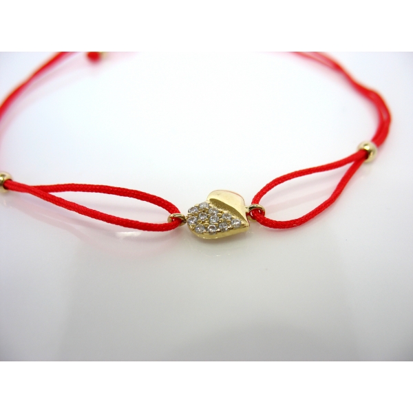 Velmi moderní náramek s červenou šňůrkou a zlatými kuličkami a srdíčkem uprostřed.