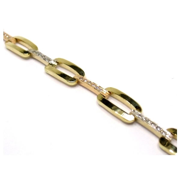 Zlatý náramek vkusně ozdobený bílými zirkony je v délce 19 cm.