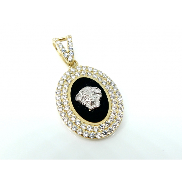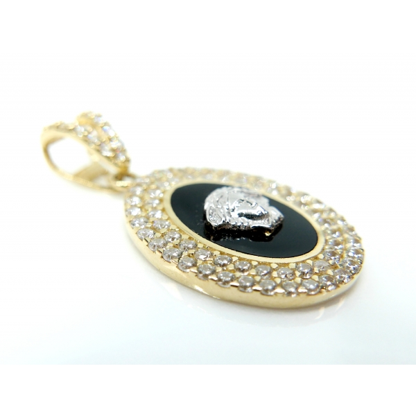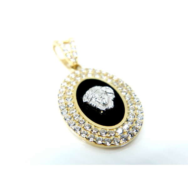 Přívěšek vyrobený ze 14kt zlata posázený zirkony a střed přívěšku zdobí hlava medůzy z bílého zlata