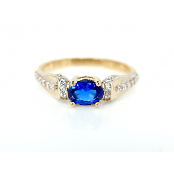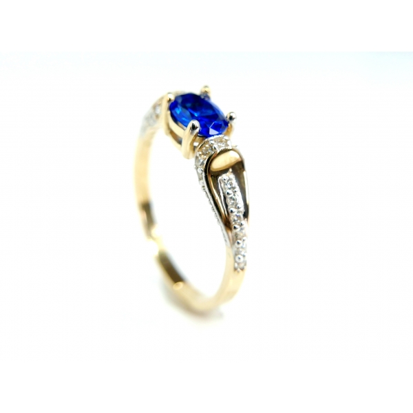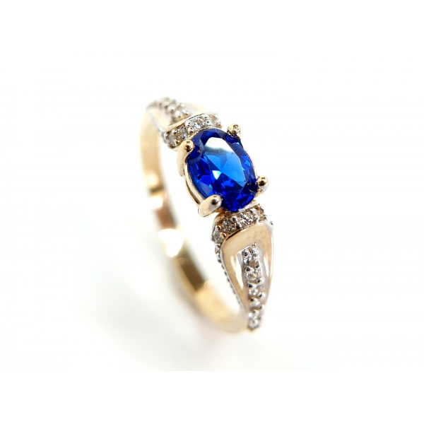 Prsten vyrobený ze 14kt zlata zdobený zirkony, středový zirkon v barvě modrý safir