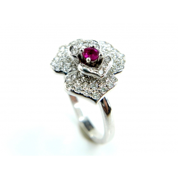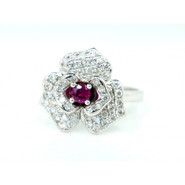 Luxusní provedení briliantového květu se středovým rubínem. Prsten je vyrobený z bílého 14kt zlata